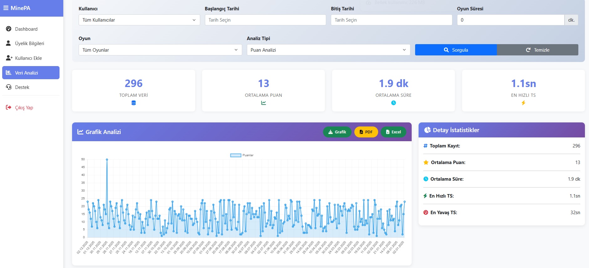 Kullanıcı bazlı gelişim grafiklerini günlük, haftalık ve aylık raporlarla takip edin.